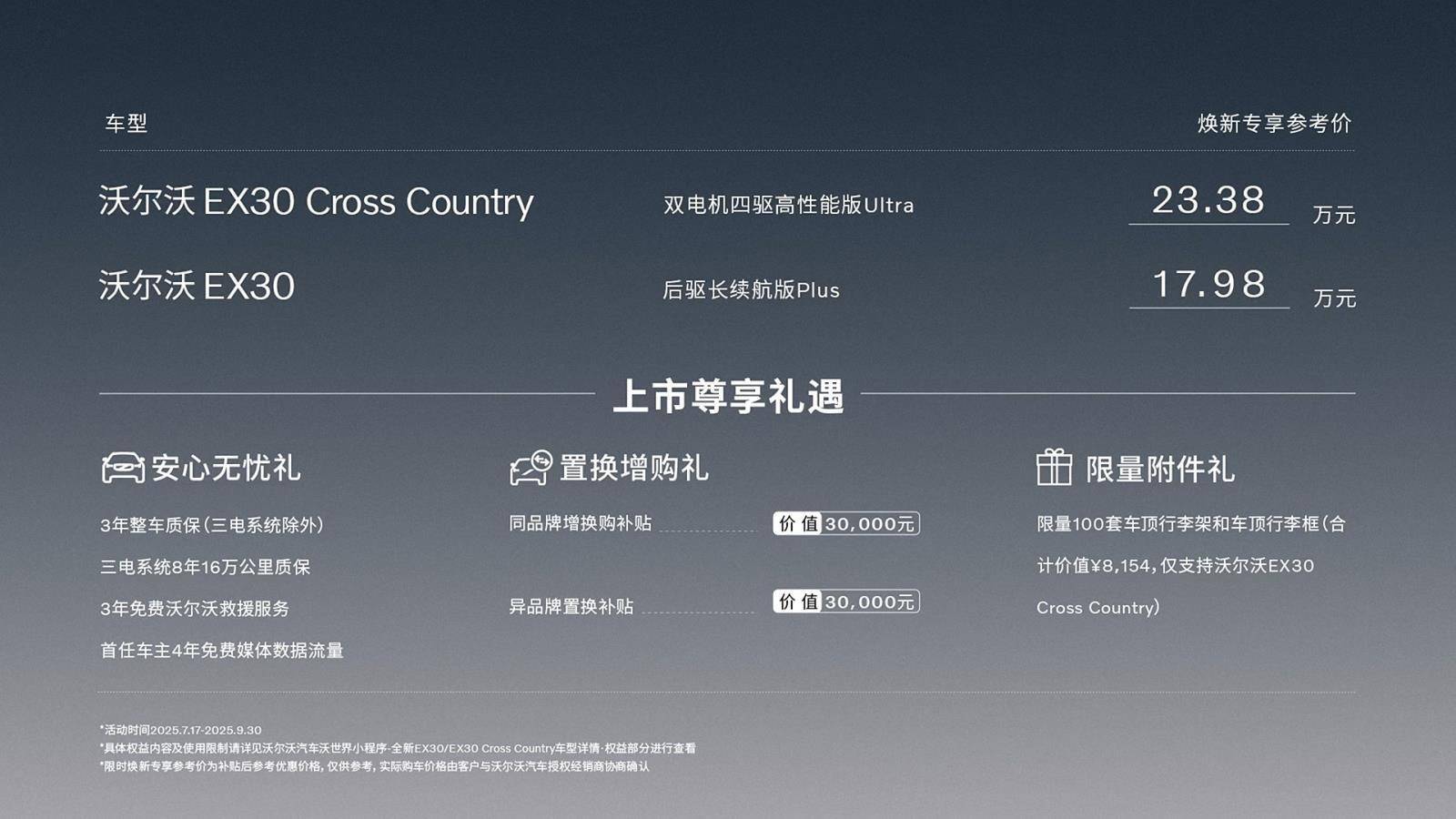 北京时间2025年7月17日,沃尔沃汽车官方宣布,沃尔沃EX30 Cross Country上市股票配资股票户网,官方建议零售价为21.98-26.38万元,官方还推出了焕新专享参考价,分别为17.98万元和23.38万元。