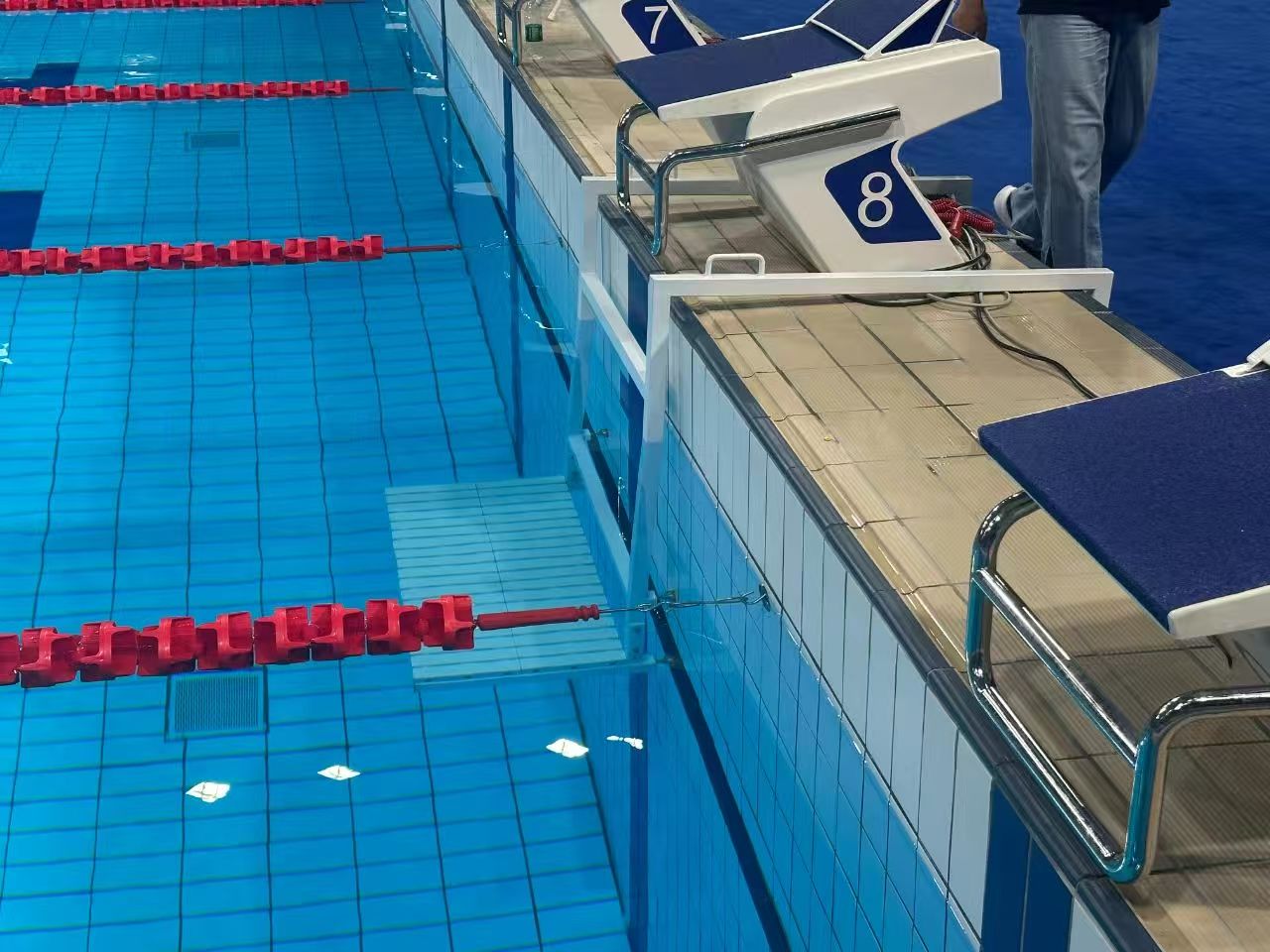 为了帮助救生和自由潜水比赛精准计时,成都体育学院三岔湖校区游泳馆安装了智能游泳出发台。场馆相关负责人王金阳介绍说,高级别赛事对泳池出发台要求很高,要做到计时非常精确,因为哪怕0.1秒的误差也可能对比赛结果产生影响,为此他们专门在泳池边装上了触控板和芯片等智能计时设备,以确保达到比赛要求。