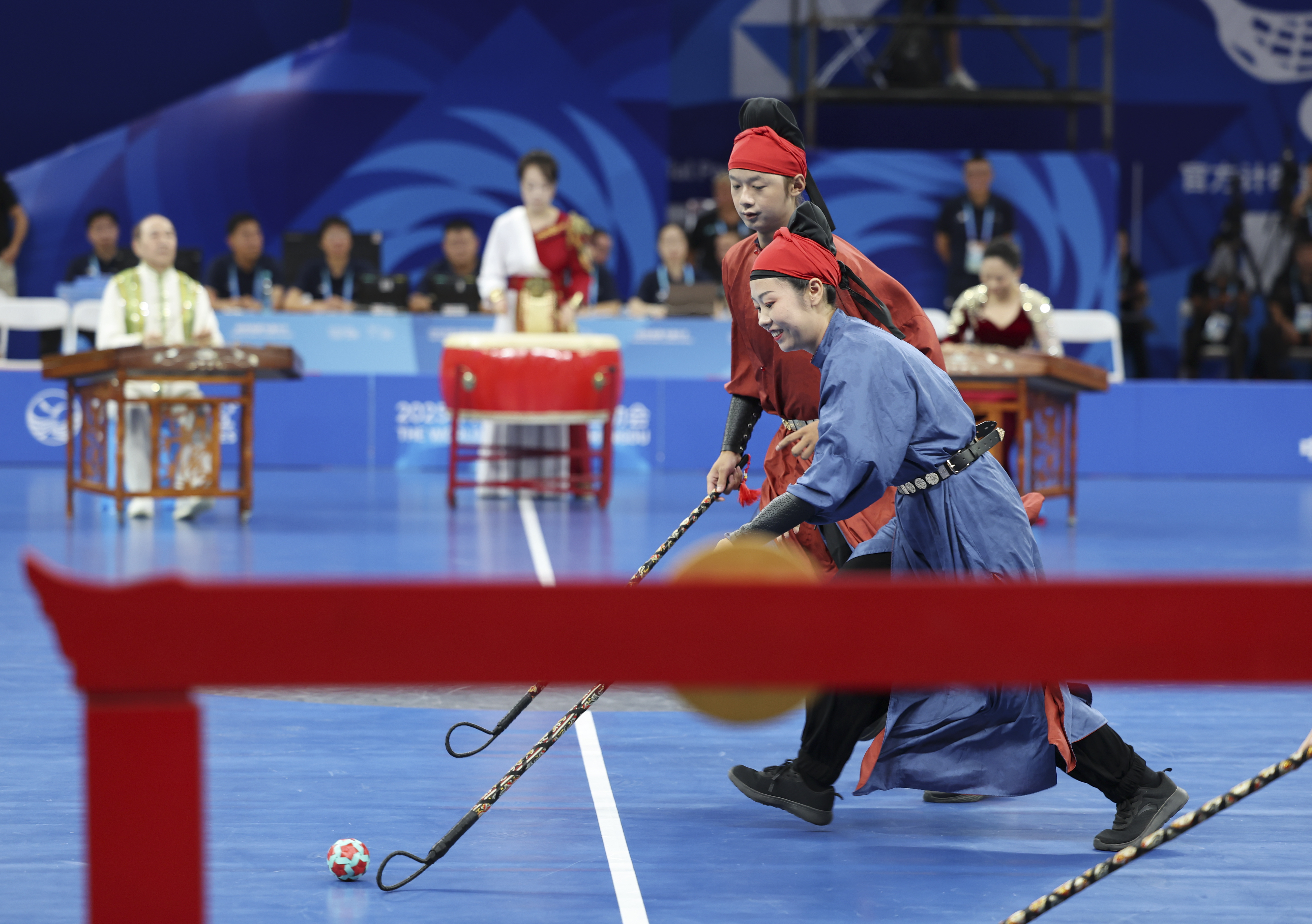 世运会不仅是竞技的赛场,更是文明互鉴的窗口。8月6日,软式曲棍球项目开赛。正式比赛之前,一场别开生面的“比赛”率先上演。循着鼓点、琴声,演员们身着唐装球衣竞逐竹编彩球,一场金堂非遗步打球表演,将现场观众带回到盛唐场景。
